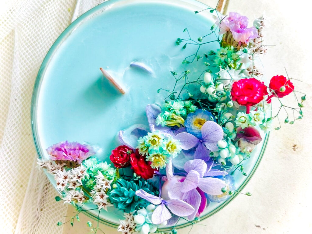 ドライフラワーや実をのせて仕上げるキャンドル作り。