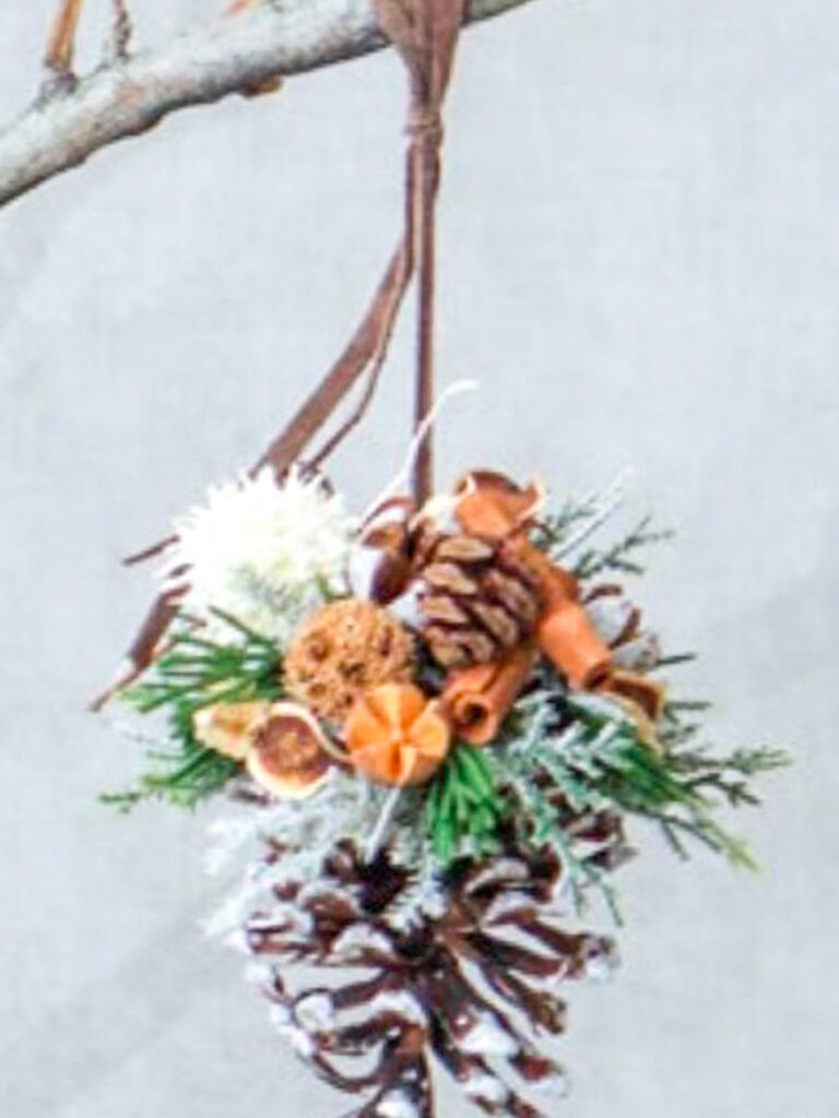 大きな松ぼっくりに、木の実やオーナメントを飾って、