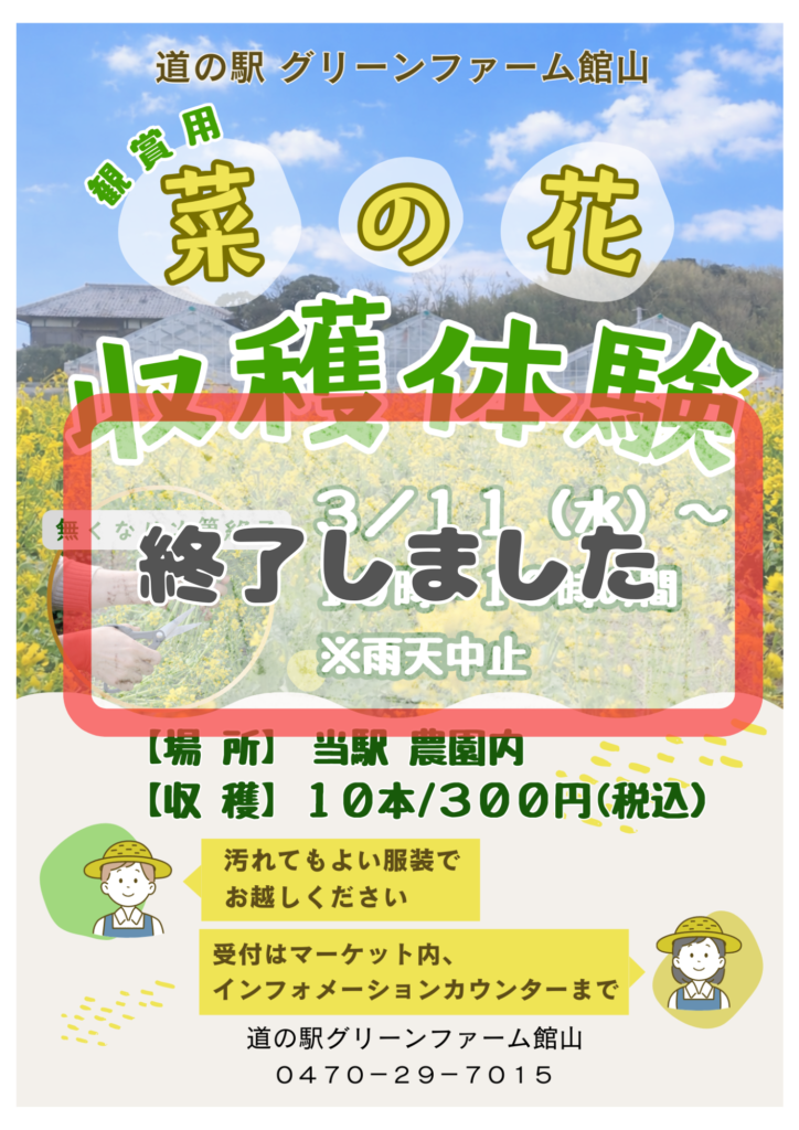 カテゴリー 観光ニュース グリーンファーム館山 菜の花収穫体験終了 投稿者 作成者: kodani 投稿日 2026.04.02 道の駅グリーンファーム館山で開催していた「菜の花(観賞用)の収穫体験」は終了いたしました。 Return ← 城山公園🏯🌸『夜桜ライトアップ』🌸開催中! → 【城山公園🏯夜桜🌸ライトアップ+竹あかりの径】 4/12まで期間延長