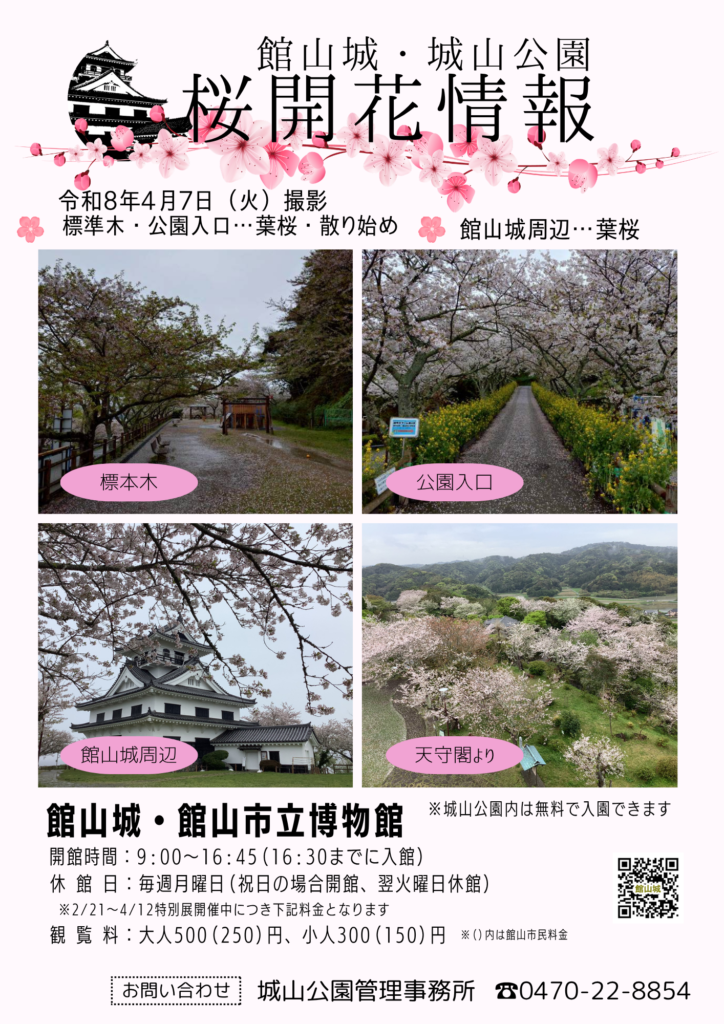 カテゴリー 観光ニュース 4/7🌸館山城🏯・城山公園🌸桜開花情報 投稿者 作成者: 出口千秋 投稿日 2026.04.09 標準木・公園入口…散り始め~葉桜 館山城周辺…葉桜 問合せ先:城山公園管理事務所 ℡0470-22-8854 https://www.tsukahara-li.co.jp/tateyama Return ← 【城山公園🏯夜桜🌸ライトアップ+竹あかりの径】 4/12まで期間延長