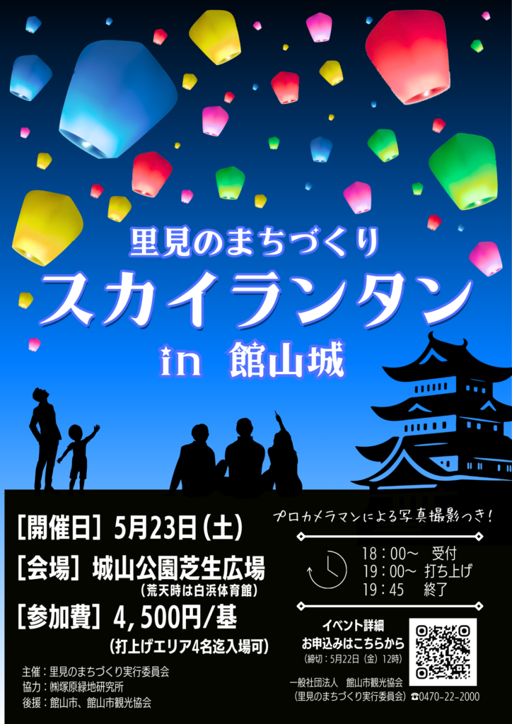 南総里見八犬伝のロマン漂う夜空へ願いを込めたランタンが天守閣に向かって舞い上がる。